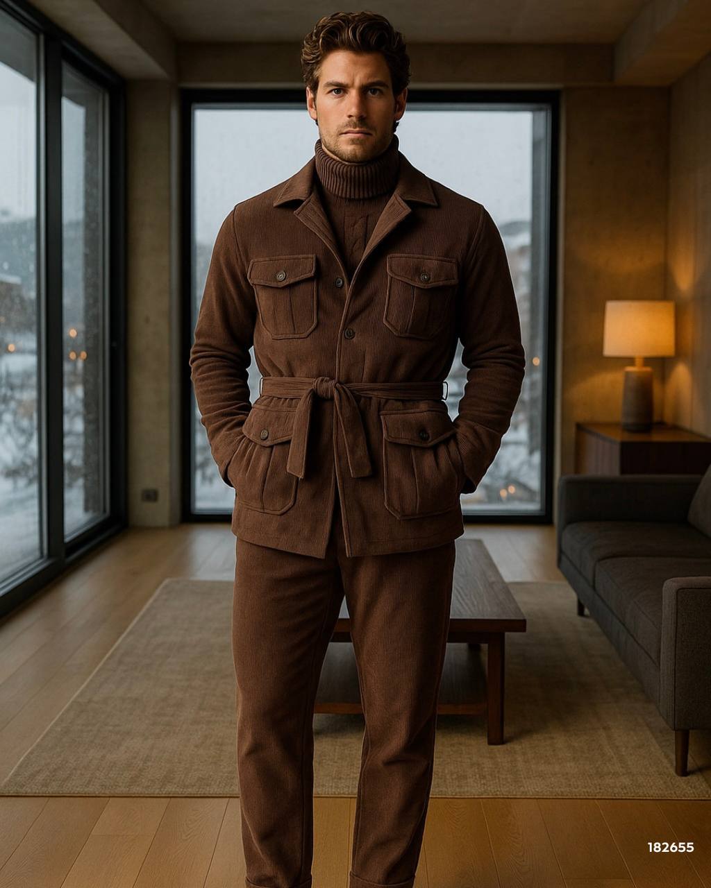 Élégant, chaud et confortable, cet ensemble VELEN en velours côtelé marron chocolat est pensé comme votre uniforme chic de saison. Il se compose d’une veste ceinturée à quatre poches, d’un col roulé texturé ton sur ton et d’un pantalon assorti à la coupe droite légèrement fuselée. La matière est douce mais structurée, idéale pour garder une belle ligne tout en restant à l’aise toute la journée.